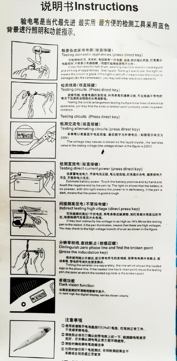 编辑:祝先生氖泡电笔用了很长时间,发现除了测最火线、零线,其他好像作用不大,现在最新出的数显电笔,作用相当大,可以测量电路,查找断线点、等等功能非常适用,可是又有很多人用不来,就拿最简单的测试火线、零线都不知道咋用,现在我把说明书奉献给大家,希望你能用到。